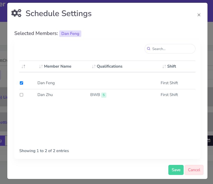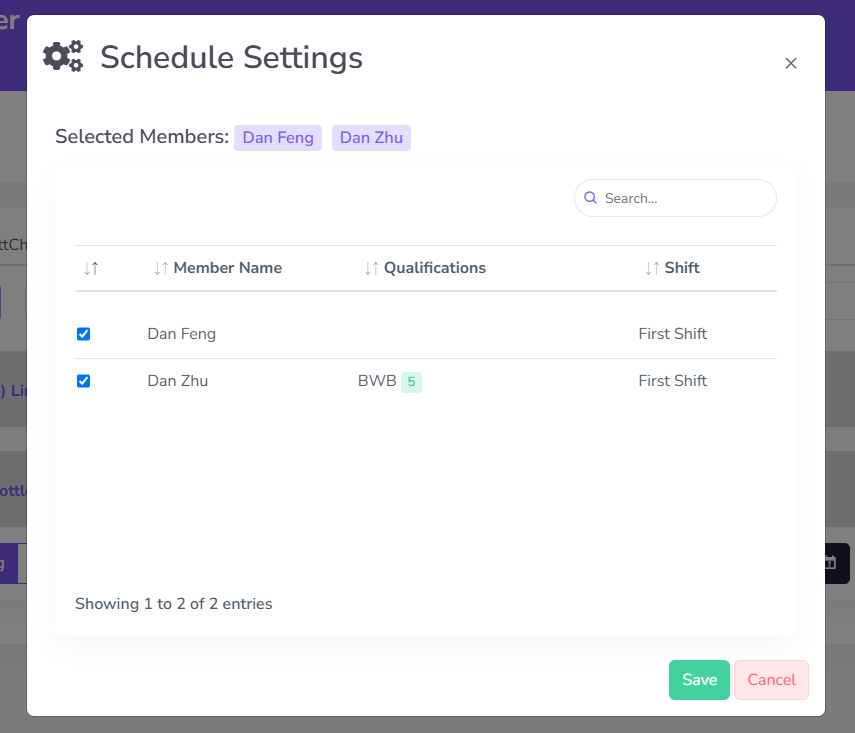 In the table, it shows details about each member available to be assigned for the Assembly Station, this includes their name, qualifications, and their shift. It also shows all selected members on the top portion of the window