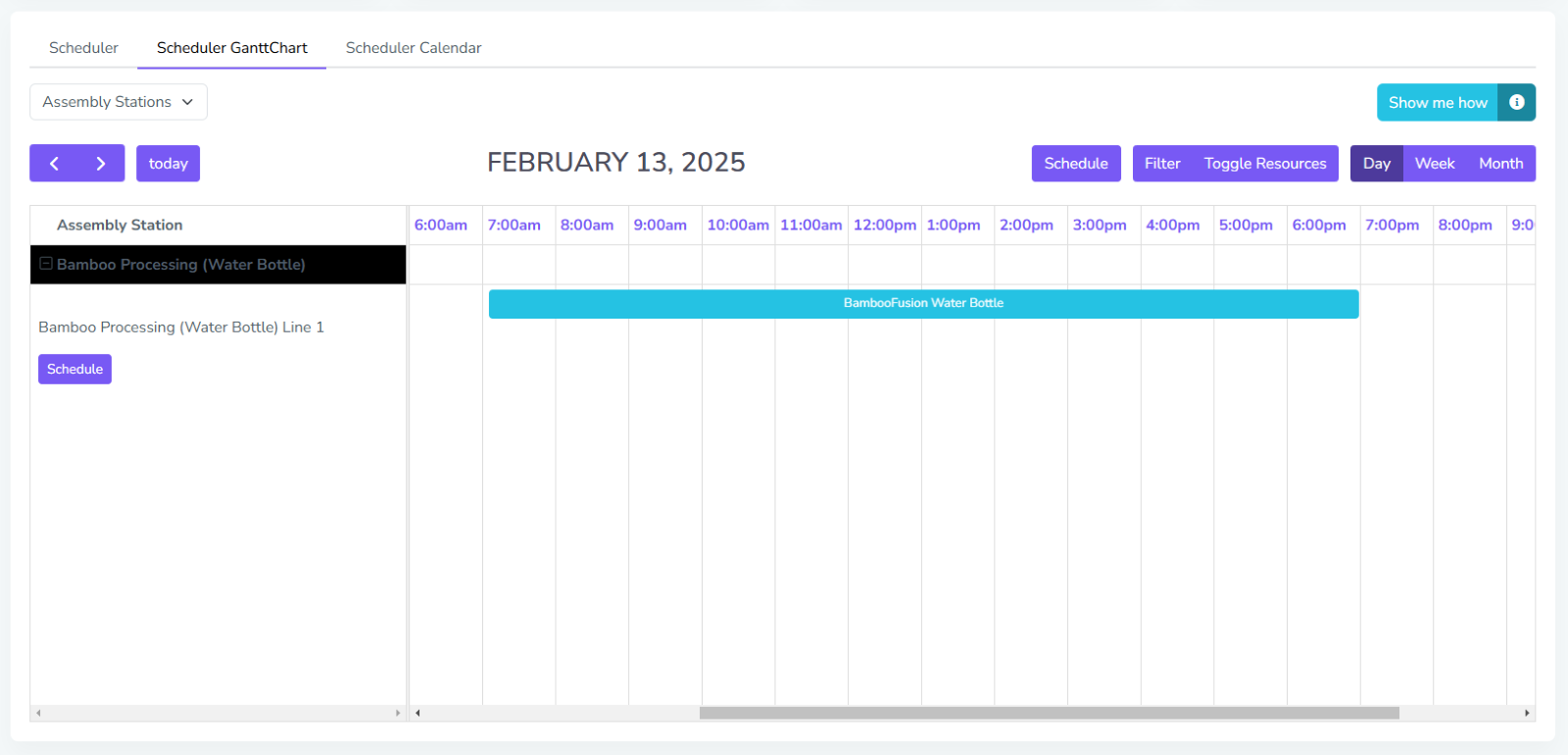 Gantt Chart/Timeline view shows a detailed view of much time is used for a specific line or order in a day, week or month