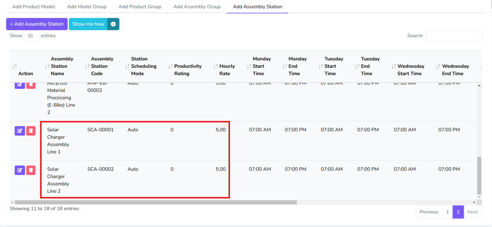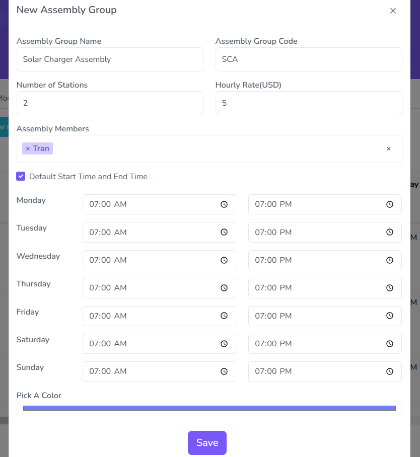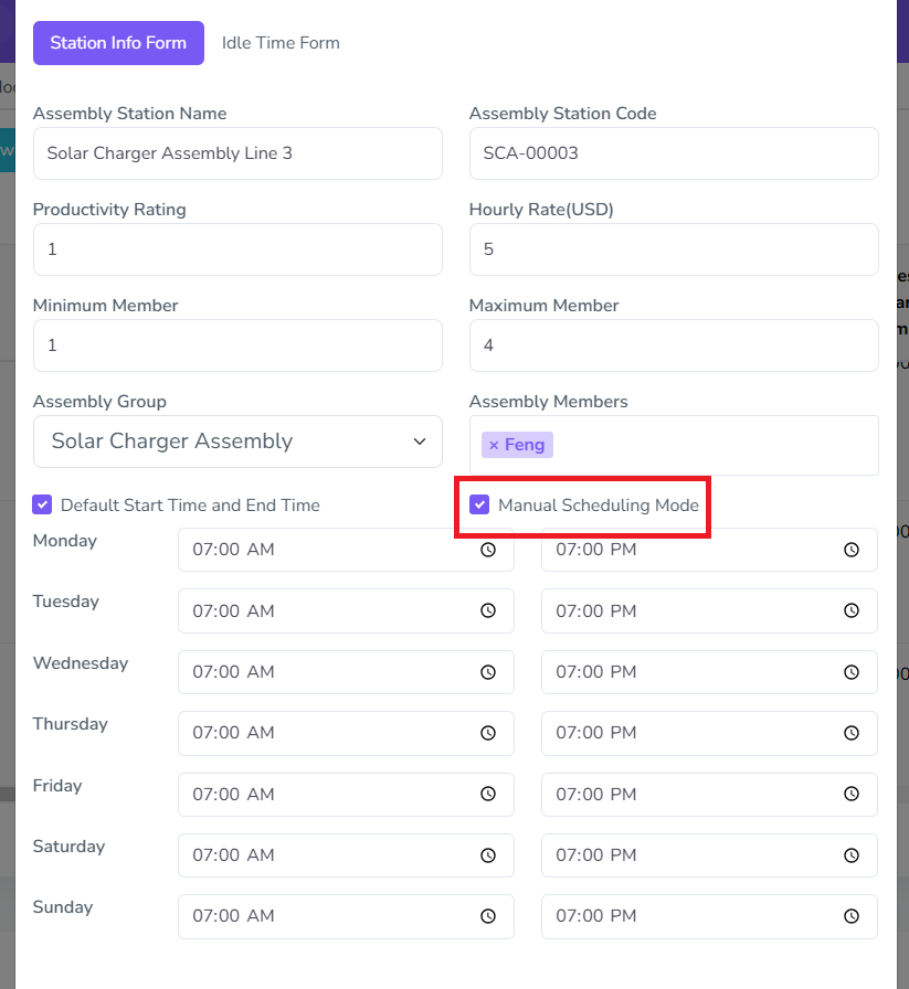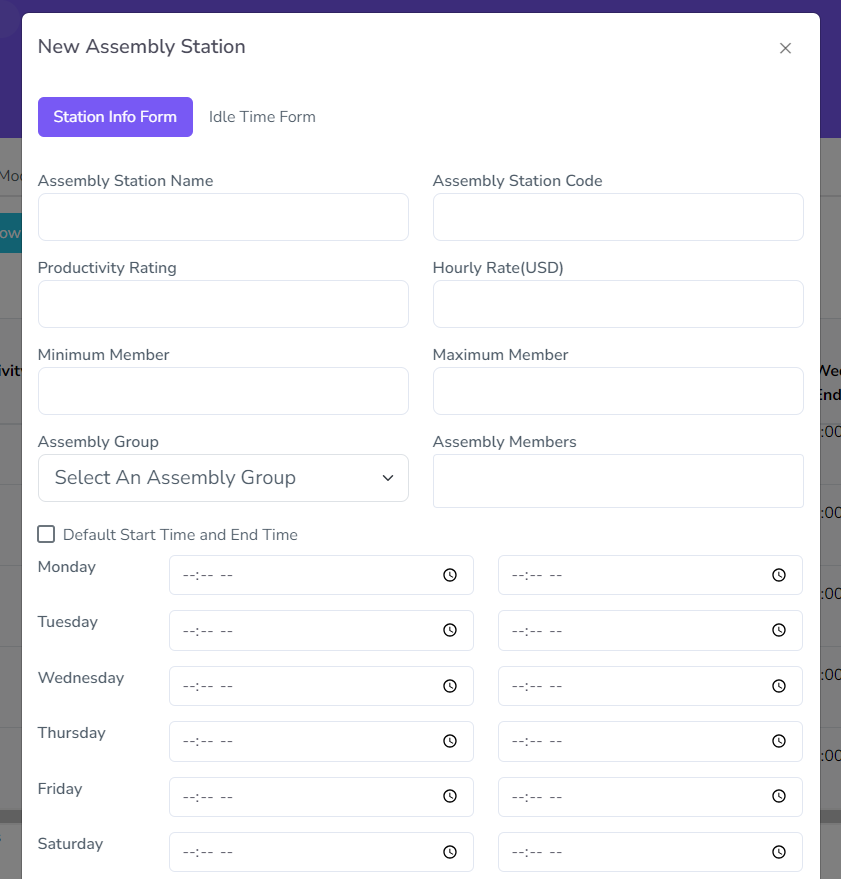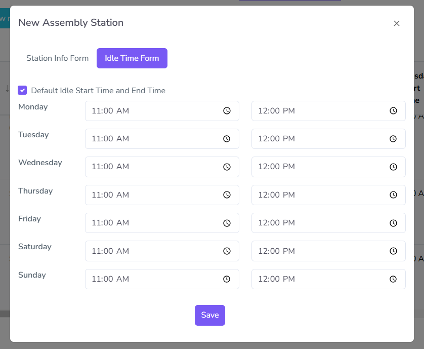 For Assembly Stations, there are two sets of configurations needed, one for station info, which includes the usual settings like the one in Assembly Group, and the Idle Time, which includes settings its idle/break times