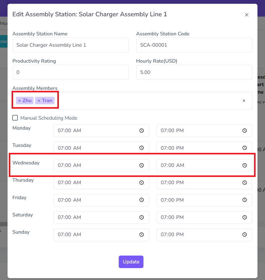 You can always edit the members and assembly station production times uniquely from each other by editing them per stations