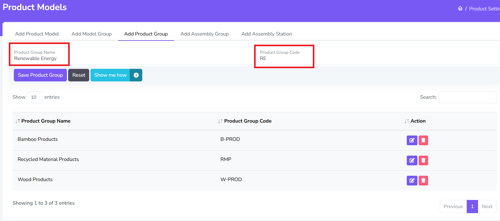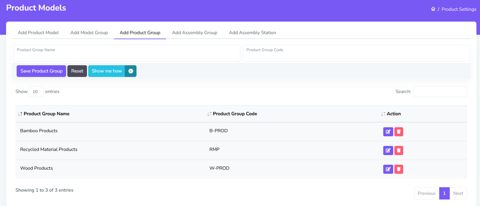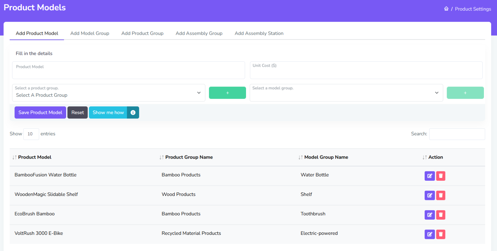 There are currently 5 views in Product Settings: Adding Product Groups, Model Groups, Product Models, Assembly Groups, and Assembly Stations